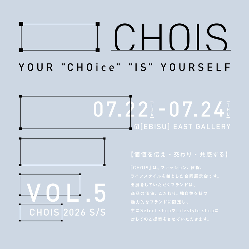 | INFORMATION | ■2/17(tue)-2/19(thu) CHOIS #6に出展致します ■2/4(wed)-2/6(fri) EXTRA PREVIEW #32に出展致します ■1/17(sat) 18(sun) FEELIN' GOOD GENERAL STORE(新潟)にてPOPUP STORE ■年末年始休暇12/28(sun)〜1/4(sun) |